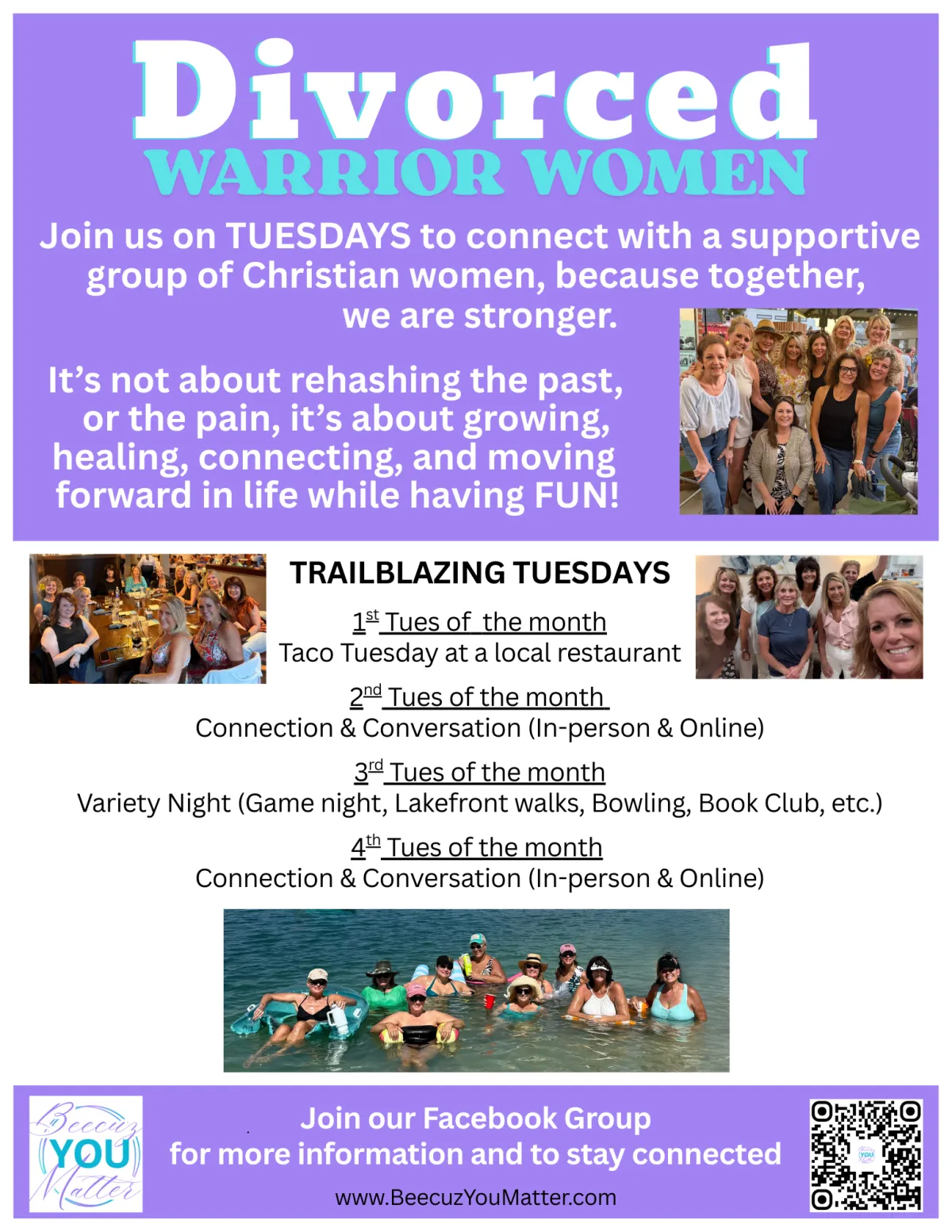 Whether you’ve been divorced (or separated) 2 weeks, 2 months, 2 years, or 22 years ago, this group has been designed just for you.